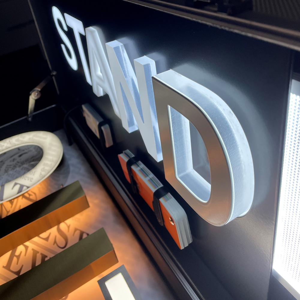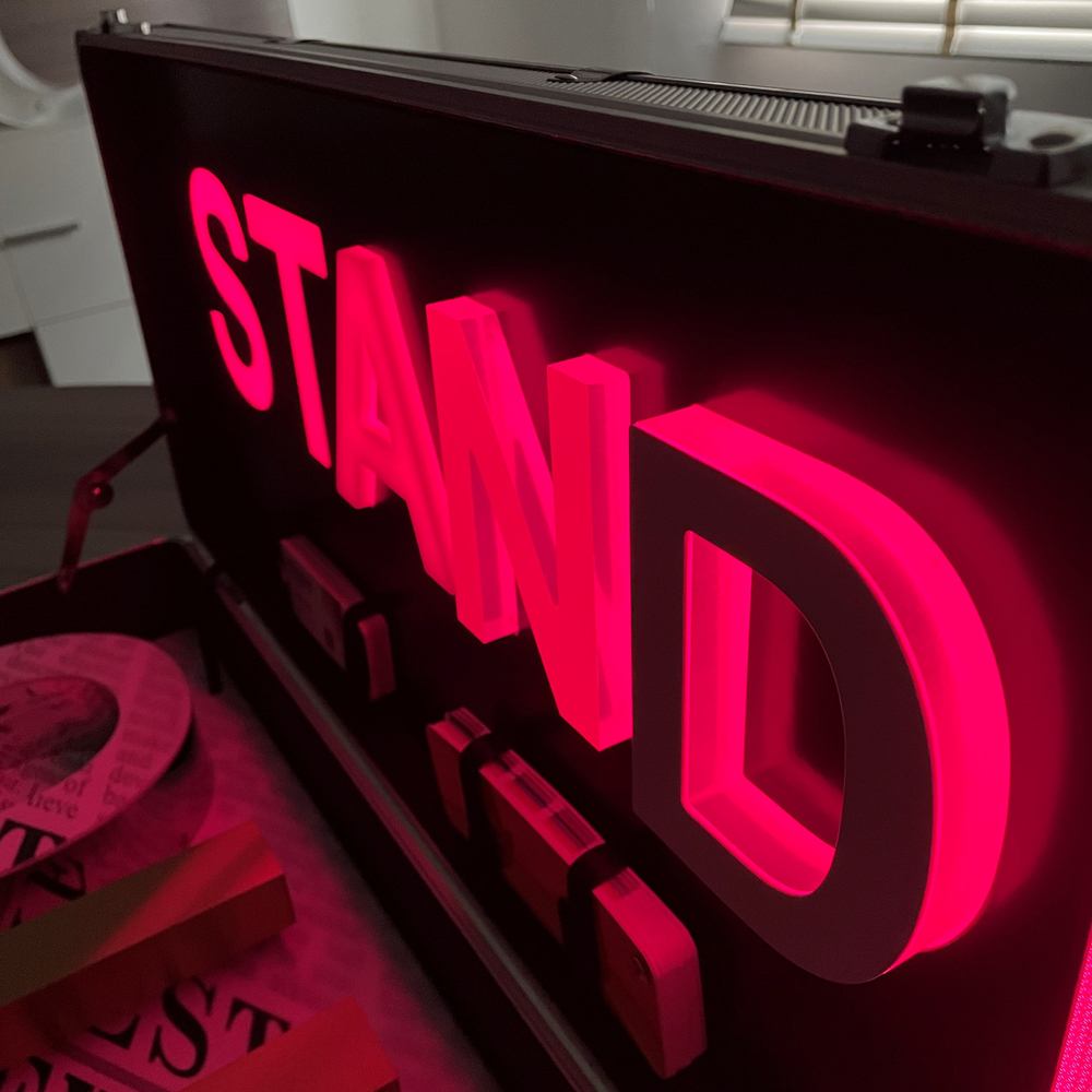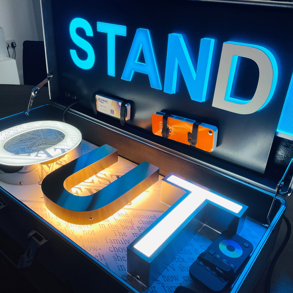 An all in one Show Case – 9 different types of illuminated signs, RAL chart, Metamark translucent vinyl swatch, an RGB remote controller. Complete with a light panel with white and RGB illumination.